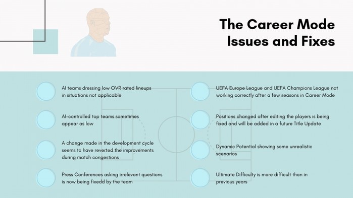 이와 관련된 세부 사항의 가장 첫 번째 부분은 바로 커리어 모드다. 커리어 모드는 사용자가 유명 리그와 팀을 선택해 시즌 경기를 치르는 옵션이지만, 최근 몇 년간 지속된 버그들로 제대로 된 경기를 즐기지 못한다는 지적이 우세하다. 이와 관련, 업체는 다음과 같은 몇 가지 최우선 개선 사항을 공개했다.