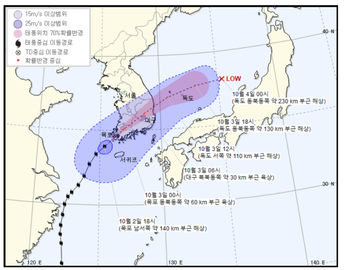 이어 태풍 미탁은 3일 18시에 독도 동북동쪽 약 130km 부근에 위치할 전망이며 4일 0시에는 독도동쪽 약 230km에 위치할 것으로 알려졌다.