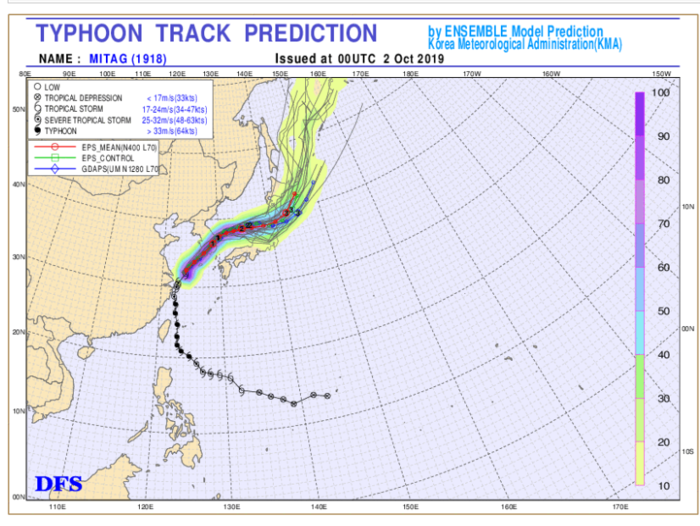 기상청의 18호 태풍 미탁 위치에 따르면 현재 태풍은 목포 남쪽 약 51km 부근에서 점점 대구로 이동 중이며 내일(3일) 오전 3시에는 대구 서남서쪽으로 이동할 전망이다.