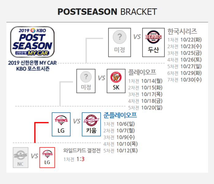 한편 2019 프로야구 한국시리즈는 두산과 플레이오프 우승팀과 펼쳐지며 10월 22일 화요일에 경기 일정이 잡혀 있다.