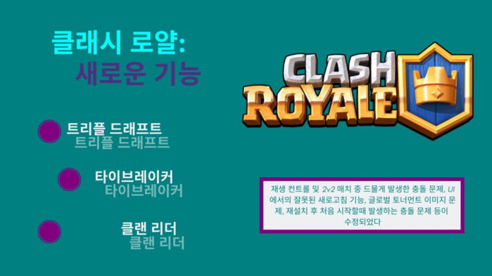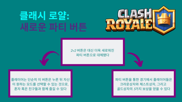 인기 모바일 게임 '클래시 로얄'이 9월 업데이트를 통해 이전의 버그 수정 및 새로운 기능을 추가했다. 개발 업체인 슈퍼셀에 따르면, 이번 패치에는 2v2 버튼이 사라지며 새로운 파티 버튼이 추가된다.