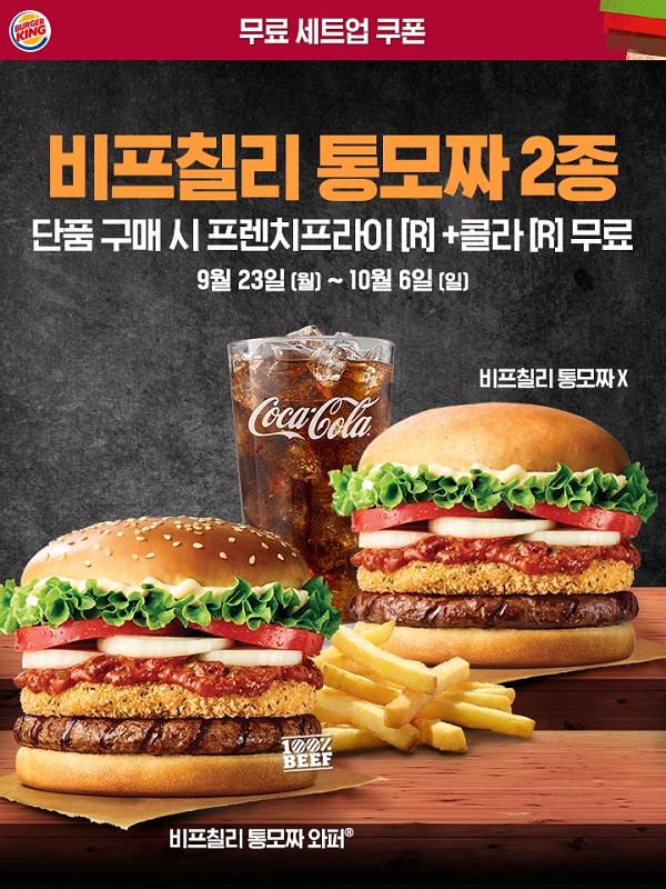 프리미엄 햄버거 브랜드 버거킹이 비프칠리통모짜와퍼 및 비프칠리통모짜X 무료 세트 업 쿠폰 증정 이벤트를 실시한다.