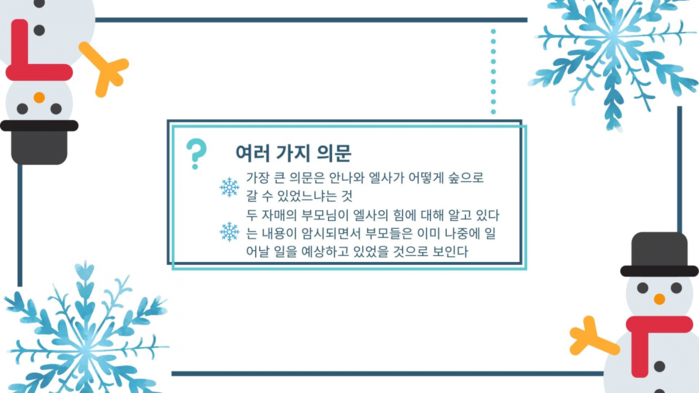 또 두 자매의 부모님이 엘사의 힘에 대해 알고 있다는 내용이 암시되면서 부모들은 이미 나중에 일어날 일을 예상했을 것으로 보인다.