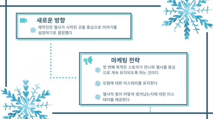 영화 예고편에서 가장 눈에 띈 것은 새로운 방향성에 대한 제안이다. 감독인 제니퍼 리에 따르면 이는 의도적으로 결정된 것이다. 감독과 제작진은 존 라세터가 만든 '겨울왕국'과는 다른 방향으로 이야기를 전개하고자 했다.