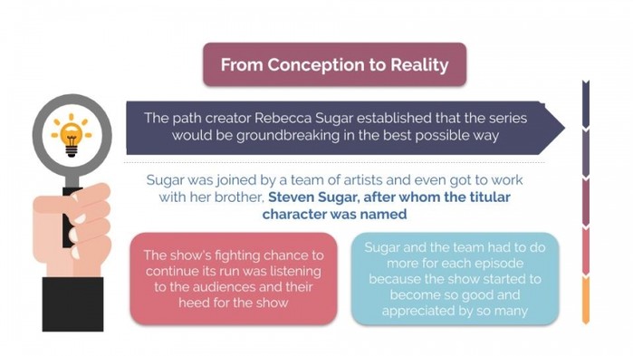 제작자 레베카 슈거는 스티븐 유니버스 시리즈가 가장 좋은 방법으로, 그리고 획기적으로 발전할 수 있다는 것을 입증하기 위해 고군분투했다. 슈거는 이 작품을 만들기 위해 인기 애니메이션 시리즈인 ‘어드벤처 타임’에 참여할 기회를 포기해야 했다. 그러나 방송사 카툰 네트워크는 슈거가 아이디어를 자유롭게 펼칠 기회를 제공했다.