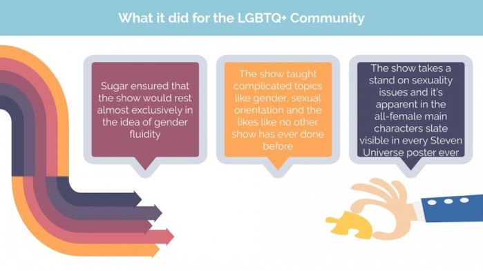 '스티븐 유니버스'의 제작진은 또한 LGBTQ+ 커뮤니티에 관심을 기울였다. 젠더 문제와 소수자들, 그리고 다양성을 존중하는 내용을 스토리에 융합했고, LGBTQ+ 커뮤니티는 이를 반겼다.