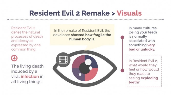 사람들은 자연적인 쇠퇴와 죽음의 과정을 이해하고 있다. 나이를 먹을수록 인체의 기능이 점점 퇴화하고 몸이 천천히 약해진다. 그러나 '바이오하자드' 속 세상에서는 다르다. 이 세계관에서는 바이러스가 퍼지면서 좀비가 등장했다. 노출된 내장, 덜렁거리는 피부와 근육, 바이러스성 돌연변이에 의해 유발된 괴물 같은 모습 등 이 게임에는 사람의 신체를 극한으로 훼손하고 왜곡한 다양한 캐릭터들이 등장한다. 플레이어로서는 공포를 느낄 수밖에 없다.
