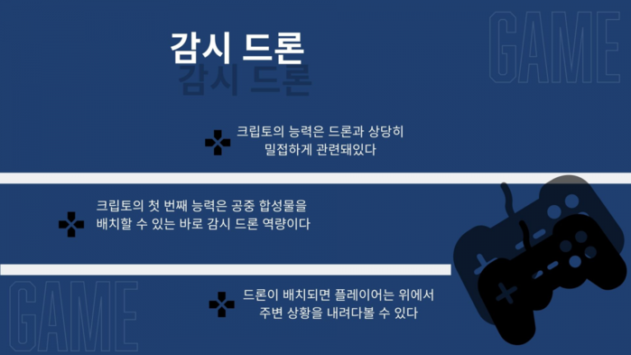 그러나 적시적소에 사용될 경우 그 효과는 모든 적들의 방어 전략을 무참히 산산조각낼 수 있다. 시나리오는 이렇다. 일단 크립토는 드론이 처음 배치되면 근처에 있는 어떤 적들이라도 탐색할 수 있으며 드론이 적을 탐지해내면 각각 이들을 표식해 아군에 노출시켜줄 수 있다.