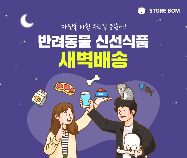 스토어봄에서 시작하는 새벽배송은 원하는 상품을 주문하면 오전 8시 전에 상품을 받아볼 수 있도록 하는 서비스이다. 전일 주문하면 다음날 새벽에 배송이 되어 상품을 빠르게 받아볼 수 있기 때문에 반려인들의 편의성이 크게 증대될 예정이다.