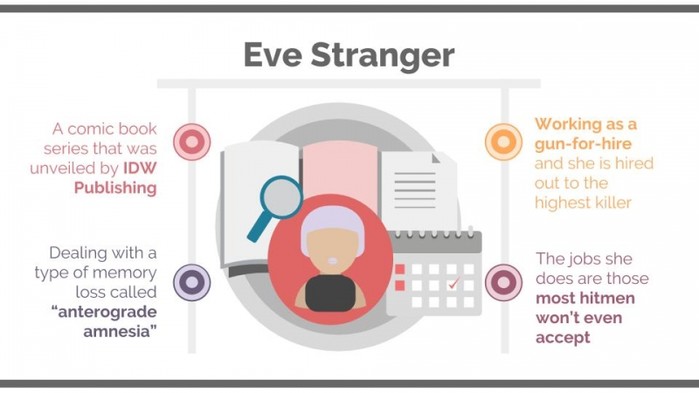 이곳에서 발간한 흥미로운 코믹스 중 하나가 이브 스트레인저라는 캐릭터가 등장하는 이야기다. 영화 '메멘토'에서는 레오나드(가이 피어스 역)가 진행성 기억상실증을 앓는 이야기가 나온다. 이브 스트레인저 또한 마찬가지다. 이브는 기억을 잃어가면서도 킬러로 일한다.