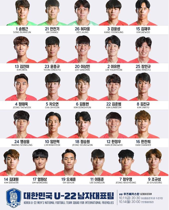 한국 우즈베키스탄 라인업을 보면 송범근, 강윤성, 정태욱, 김동현, 한정우, 김재우, 엄원상, 오세운, 윤종규, 맹성웅, 장민규가 선발에 올랐다.