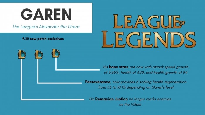 게임의 공식 패치 노트에 따르면 라이엇 게임즈는 이 게임의 선구적인 탱커인 가렌의 전체 기술 키트에 큰 변경사항을 적용했다. 우선 가렌의 기본 스탯 중 공격 스피드가 3.65% 증가했고, 체력은 620으로 증가했다. 체력 증가량은 84로 늘었다.