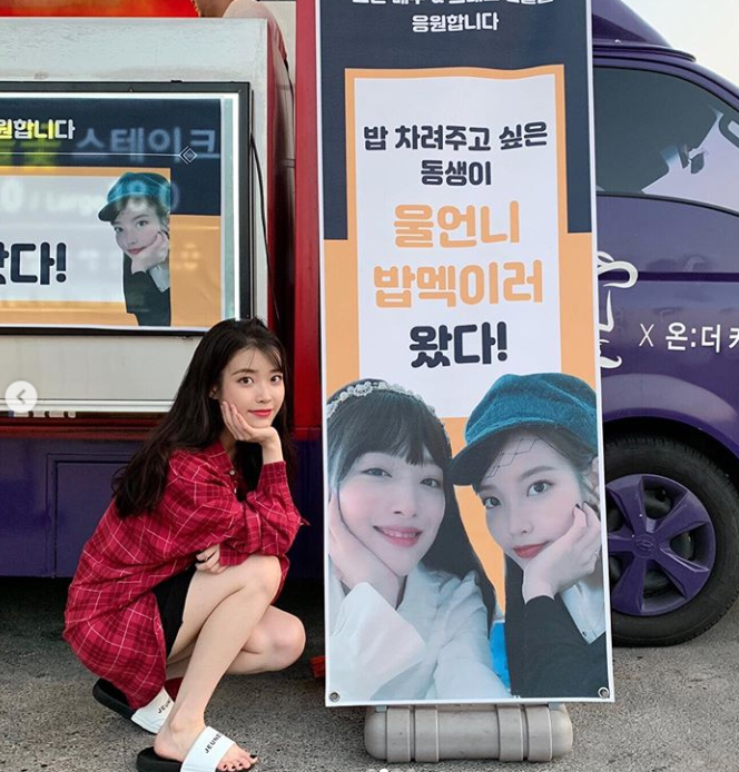 설리는 "밥 차려주고 싶은 동생이 울 언니 밥멕이러 왔다!"라는 문구를 적어 '호텔델루나' 촬영 현장에 촬영 스태프들을 위해 밥차를 보냈다.