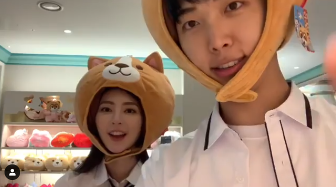공개된 영상 속 두 사람은 캐릭터샵에서 동물 모자를 쓰고 머리를 흔들며 귀여운 장난을 치고 있다.