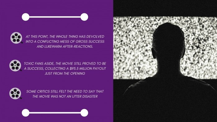 미국의 뉴스 웹사이트인 복스에 따르면 이 영화는 다양한 논란을 빚으며 우려를 불러일으켰던 점을 만회하기라도 하듯 미국 내 오프닝 성적만으로 9,350만 달러(약 1,108억 원)를 벌어들였다. 비평가와 관객들의 평은 여전히 양쪽으로 나뉘고 있지만, 영화가 성공했다는 사실에 대해서는 이견의 여지가 없어 보인다.