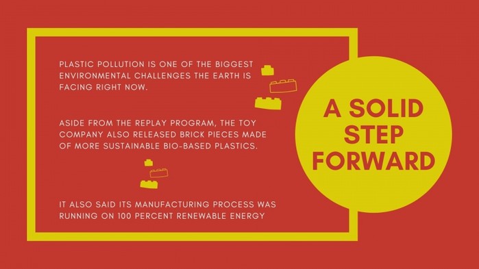물론 모든 레고 공장 시설이 완전히 재생 가능한 에너지로 운영되는 것이 아니지만 레고의 모회사 키르크비(Kirkbi)는 재생 가능 에너지에 막대한 투자를 하고 있다. 회사의 지속 가능성 목표를 달성하기에는 아직 멀었지만 현재 이니셔티브는 이들의 확고한 발걸음을 나타낸다. 레고 리플레이 프로그램의 경우 레고 블록이 반복적으로, 오랜 기간 사용될 수 있다는 레고 측의 의도를 잘 나타낸다.