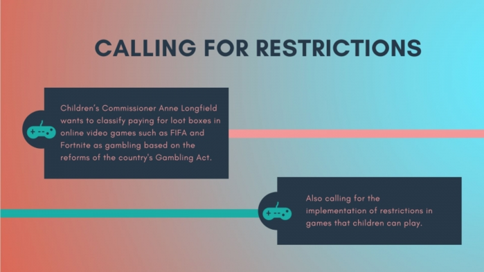 롱필드 위원장은 피파나 포트나이트 등의 온라인 게임 내 랜덤박스를 국가 도박법에 분류해야한다는 입장을 강력히 설파했다. 또한 아이들이 접근할 수 있는 게임들에도 제한을 둬야한다고 강조했는데, "심지어 일부 아이들은 손실에도 불구 수 백 파운드를 소비하고 있다"며 현 상황의 심각성을 전했다.