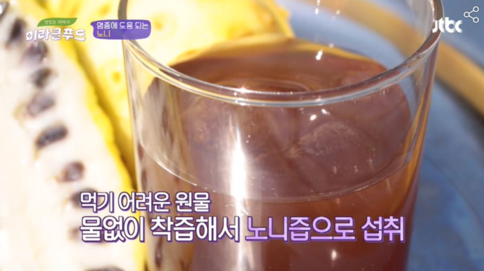 슈퍼푸드, 건강식품으로 오랜 기간 사랑받고 있는 노니, 노니는 열대과일로 모습은 다소 징그럽지만 효능은 뛰어나다. 노니는 200여 가지가 넘는 식물 영양소가 함유돼 있다고 한다. 폴리페놀은 키위나 망고 수백 배며 풍부한 스코폴레틴으로 항염 작용이 탁월하다. 비타민, 미네랄, 섬유질이 많아 항염뿐 아니라 피부 미용, 변에 좋은 음식이며 독소 배출을 원활하게 해 디톡스 다이어트를 준비하는 사람들도 주목할 만하다.