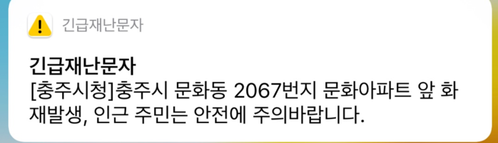 이에 누리꾼들은 '충주 문화아파트에 화재가 난듯요' '저도 문자 받았어요 인명 피해가 없길' '주소를 찍어보니 지구대 뒷쪽이에요' 등 다양한 반응을 보였다.