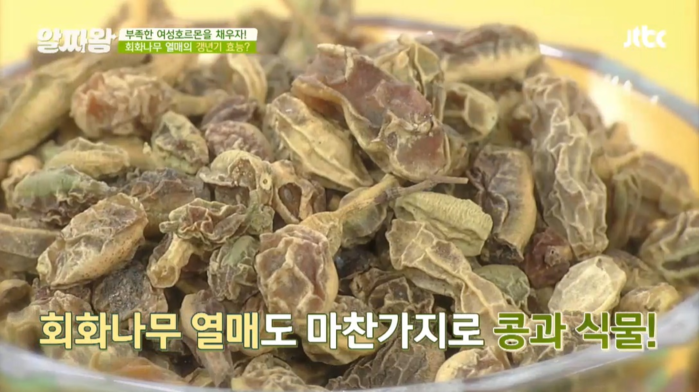 회화나무 열매가 주목을 받는 것은 이소플라본이 풍부하기 때문이다. 이는 콩류에 많이 들어있는 천연 식물성 에스트로겐으로 이는 에스트로겐 분비를 유도하거나 그 역할을 대신한다.