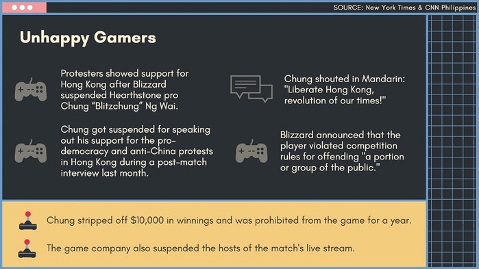 이 프로 게이머 블리츠청은 인터뷰에서 ‘광복홍콩, 시대혁명’이라고 말했고 블리자드는 이것이 정치적인 발언이라며 그에게 징계를 내린 바 있다.