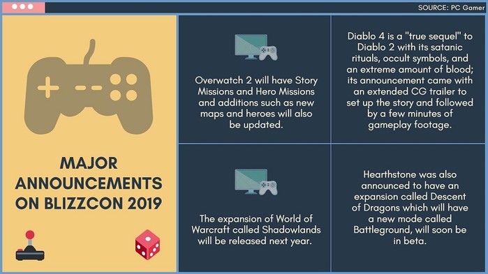 블리자드는 기존의 프랜차이즈에 대해 두 가지 주요 게임과 두 가지 확장 게임을 발표했다. 이들은 '오버워치 2'와 '디아블로 4'의 개발을 확인했고 '월드오브워크래프트(와우)'와 '하스스톤'의 확장을 발표했다.