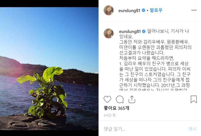 가수 심은진은 6일 오늘 자신의 SNS에 장문의 글을 올렸다. 그는 시멘트 바닥에서도 싹을 낸 한 장의 풍경과 함께 ‘일어나보니, 기사가 나있네요. 그동안 저와 김리우배우, 원종환배우,미연이를 오랜동안 괴롭혔던 피의자의 선고결과가 나왔습니다’라고 적었다.