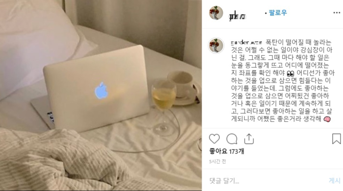 최근 김정원은 자신의 SNS에 한 장의 사진과 함께 장문의 글을 게재했다. 그는 ‘폭탄이 떨어질 때 놀라는 것은 어쩔 수 없는 일이야 강심장이 아닌 걸. 그래도 그때 마다 해야 할 일은 눈을 동그랗게 뜨고 어디에 떨어졌는지 좌표를 확인 해야’라고 적었다.