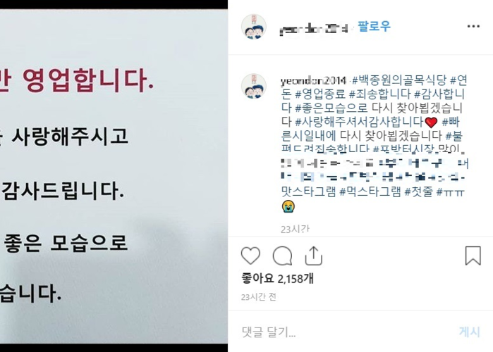 최근 '포방터 돈까스' 측은 SNS를 통해 영업 종료 소식을 전했다. 한장의 사진 속에는 '오는 15일까지만 영업합니다'며 '그동안 사랑해주시고 아껴주셔서 진심으로 감사드립니다 조만간 더 나은 곳에서 좋은 모습으로 다시 찾아 뵙겠습니다'라고 적었다.