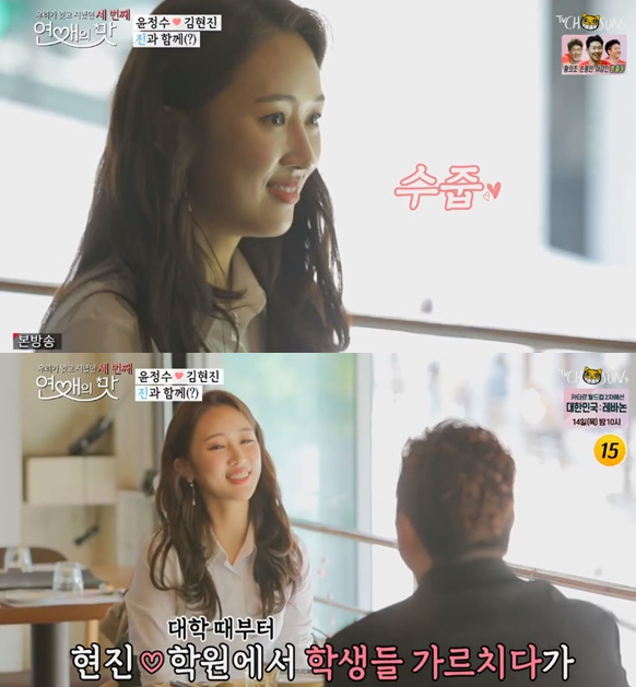 이날 등장한 윤정수의 소개팅녀 김현진은 현재 수학과학을 가르치는 학원 강사로 키 170cm에 아찔한 미모로 윤정수를 깜짝 놀라게 했다.