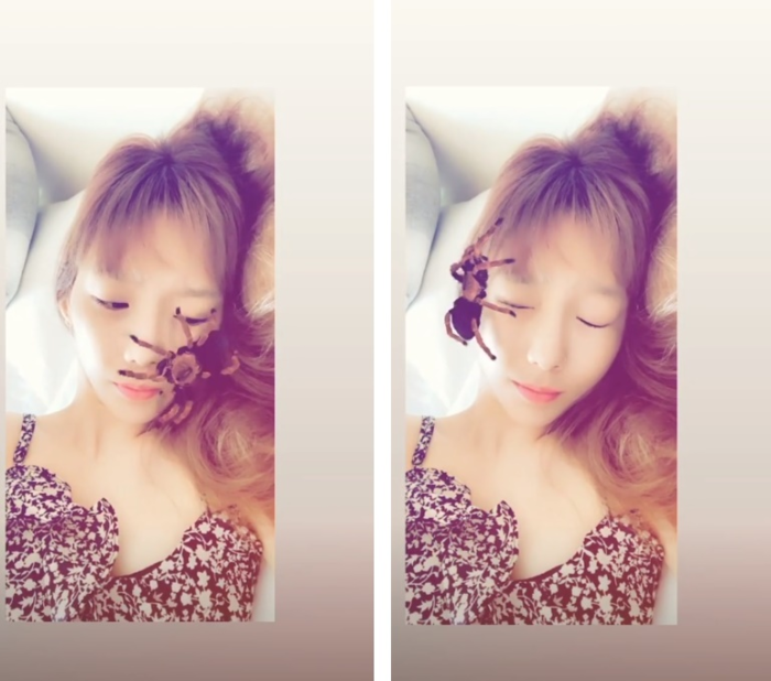 최근 태연은 자신의 SNS 스토리에 한 편의 영상을 공개했다. 영상을 살펴보면 그의 얼굴 위로 거미가 지나다니고 이에 마치 실제 상황인 듯 찌푸리는 표정을 짓고 있다.