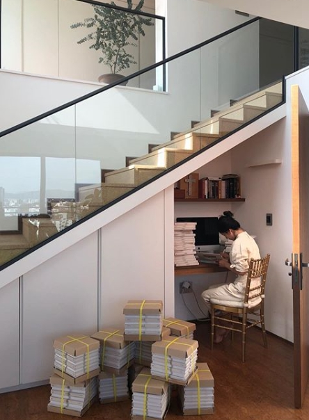 공개한 사진에는 정혜영이 수북히 쌓인 책에 둘러 싸여 책상에 앉아 책을 보고 있는 모습이 담겨져 있다.