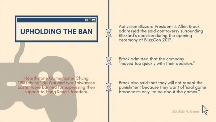 논란이 커지자 블리자드는 이번 블리즈컨에서 사과했지만, 해당 '하스스톤' 프로 게이머와 두 명의 대만인 게임 캐스터에 대한 출장 정지를 철회하지 않을 것이라고 말한 바 있다.