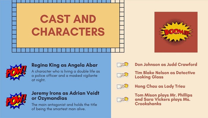'왓치맨'에는 다양하고 풍부한 캐릭터들이 등장한다. 이 캐릭터들은 TV 시리즈 제작이 결정되기 전부터도 충성도 높은 팬에게 많은 인기를 끌었다. 주요 캐스팅으로는 오스카 상을 수상한 경력이 있는 배우 레지나 킹이 있는데, 킹은 안젤리나 아브라함 역할을 맡았다. 낮에는 경찰관, 밤에는 마스크를 쓴 자경단원으로 이중의 삶을 사는 인물이다.