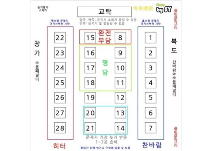 이밖에 교탁 바로 앞자리는 ‘완전 부담’으로 창가, 복도 자리는 '찬바람', '소음 패널티' 등이 언급돼있다. 이밖에 홀수형 문제지, 짝수형 문제지가 시작되는 위치와 문제지를 가장 늦게 받는 자리도 표시돼 있다.