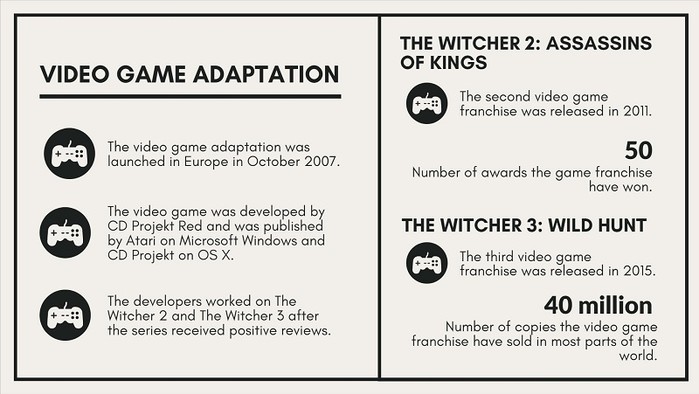 시리즈가 전 세계적으로 엄청난 인기를 끌자, 2007년 10월에는 비디오 게임 버전으로도 출시됐다. 3D 액션 어드벤처 및 롤 플레잉 장르로, 씨디 프로젝트 레드가 개발, 아타리가 PC용으로 유통 배급했다.