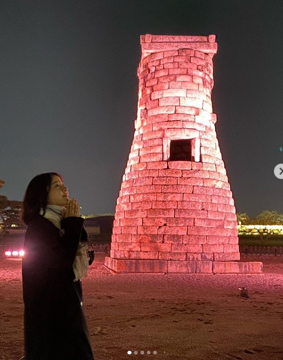 공개한 사진에는 박은혜가 첨성배를 배경으로 기도하는 듯한 포즈를 취하고 있다.