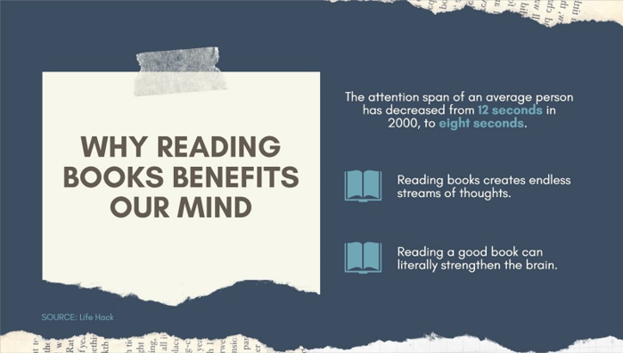 일반인의 주의 집중 시간이 2000년도 12초에서 오늘날 8초로 줄어들었다. 따라서 아무리 책을 좋아하는 사람이더라도 독서 시간이 짧아졌고 나머지 시간에는 스마트폰을 들여다보고 소셜 미디어 계정을 확인한다.