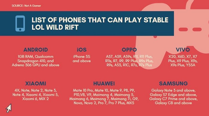 와일드리프트를 플레이하려면 스마트폰이 1GB 이상의 RAM을 갖고 있어야 한다. 오래된 칩셋을 가진 스마트폰이어서 반드시 업그레이드를 거쳐야 하는 제품이 아닌 이상 대부분의 스마트폰에서 와일드리프트를 플레이할 수 있다는 장점이 있다. 이 게임을 하기 위해서는 퀄컴 스냅드래곤 410, 또는 아드레노 306이 필요하다.