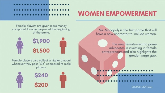 일반적인 '모노폴리' 게임에서는 플레이어가 부동산 거물이 되는 것이 목표다. 이번 신작 게임에서는 플레이어가 여성 기업가로 성장하는 것이 목표다. 이 게임은 여성들의 혁신에 주의를 기울일 뿐만 아니라 남녀 간의 임금 격차도 부각시킨다.