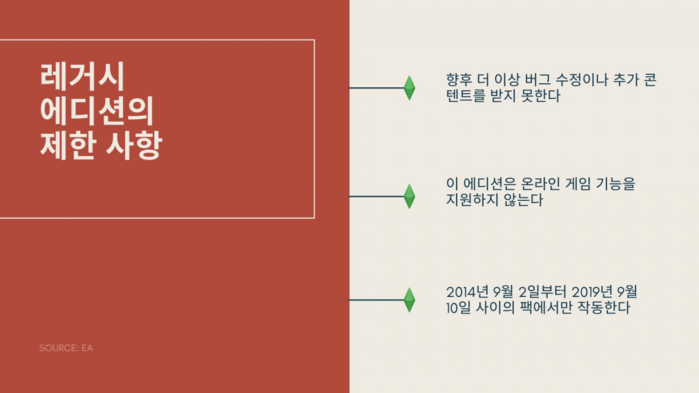 개발사에 따르면 변경 사항들은 전반적으로 적용되며, 새로운 사양은 기본 게임과 팩이 함께 작동하는 방식에 영향을 미친다. 이로 인해 레거시 에디션에 대한 제약이 발생할 수 있는데, 주요 제한 사항들은 다음과 같다.