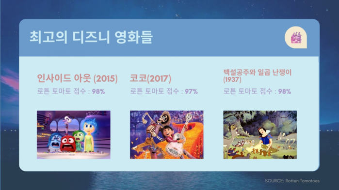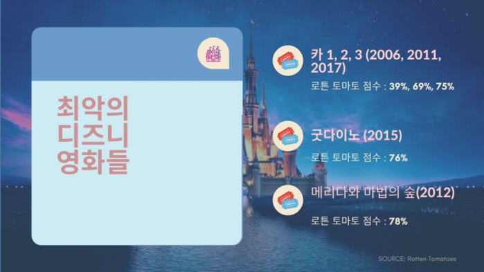 그러나 대부분 디즈니 애니메이션 영화는 성공을 거둔다. 모든 연령대의 사람들에게 사랑받기 때문이다. 어린이들에게는 꿈과 희망을, 성인에게는 향수를 선사한다. 그렇다면 영화 평점 사이트인 로튼토마토에서 최고 혹은 최악의 점수를 기록한 디즈니 애니메이션 영화는 무엇일까?