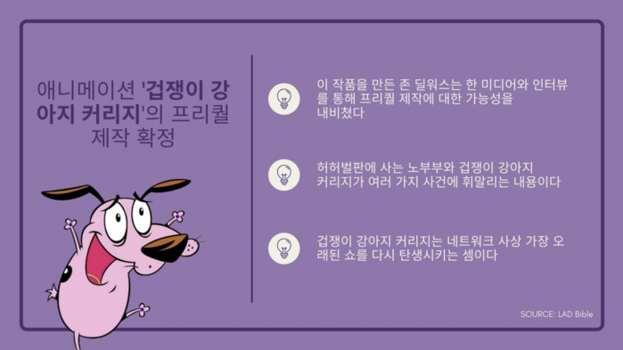 분홍색 강아지가 등장하는 애니메이션 '겁쟁이 강아지 커리지'의 팬들이 기뻐할 만한 소식이 있다. 이 쇼의 프리퀄이 카툰 네트워크로 돌아올 예정이다. 이 애니메이션 시리즈는 4시즌 방영됐는데, 캔자스주 허허벌판에 사는 노부부와 겁쟁이 강아지 커리지가 여러 가지 사건에 휘말리는 내용이다. SF물이기 때문에 시청자의 상상력을 자극하는 에피소드가 많다.