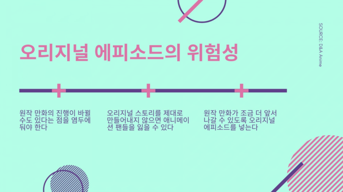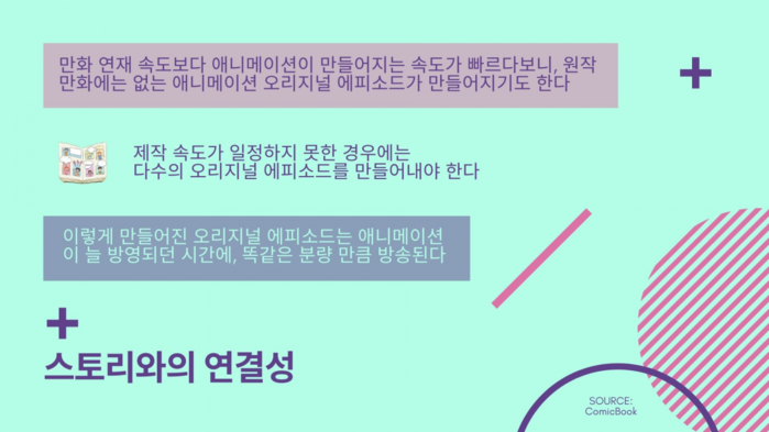 첫 번째는 원작 만화의 진행이 바뀔 수도 있다는 점을 염두에 둬야 한다는 것이다. 만약 원작 만화가 휴재를 하거나 일부 연재가 캔슬된다면 애니메이터들은 오리지널 에피소드를 이어서 만들어야 한다. 원작 만화가 더 이상 가이드 라인의 역할을 하지 않기 때문에 오리지널 스토리를 제대로 만들어내지 않으면 애니메이션 팬들을 잃을 수 있다.