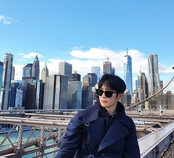 공개한 사진에는 정해인이 뉴욕의 빌딩들을 배경을 선그라스를 낀채 어딘가를 응시하고 있다.