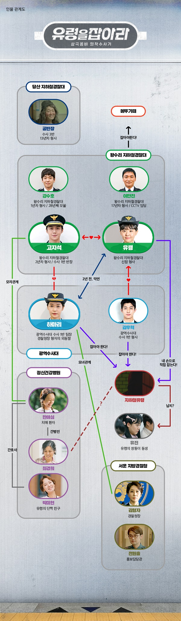 유령을 잡아라 줄거리는 연쇄살인범 ‘지하철 유령’을 잡기 위해 고군분투하는 지하철 경찰대의 이야기다. 문근영이 연기하는 등장인물 유령은 2년 전 쌍둥이 동생이 실종, 이를 연쇄살인범 지하철 유령의 소행임을 확신하고 지하철 경찰대에 지원한 신참 형사다. 김선호가 연기하는 고지석은 경찰대 수석 졸업 후 강력반에서 활약했지만 홀어머니가 치매라는 사실을 알고 지하철 경찰 공무원에 몸을 담갔다. 문근영이 이 드라마 무려 4년 만에 안방극장을 찾았다. 국민 여동생으로 불렀던 문근영이의 올해 나이는 만 32세다. KBS 간판 예능 1박 2일의 새 멤버로 합류하게 된 김선호는 만 33세로 둘의 나이 차이는 1살이다.