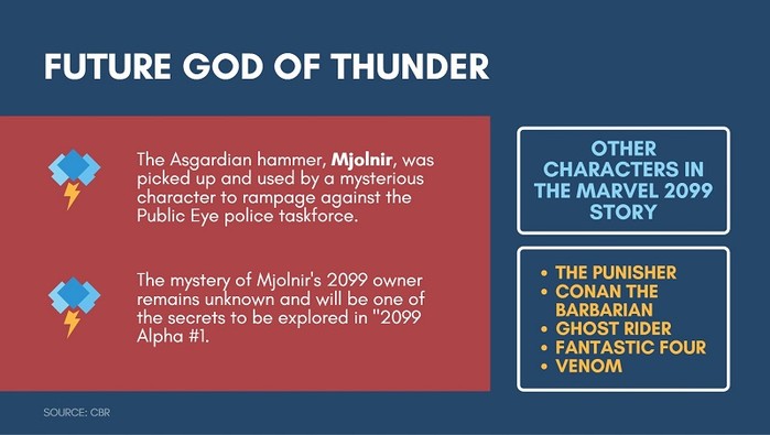 '2099 알파' 코믹스의 첫 번째 이슈에서 천둥의 신이 돌아온다는 암시가 있었다. 토르가 사용하는 망치인 묠니르가 정체를 알 수 없는 어떤 캐릭터에 의해 사용되고 있는 모습이었다.