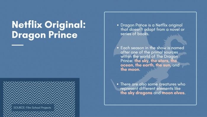 영화 전문 웹사이트 필름 스쿨 프로젝트에 따르면, 드래곤 프린스는 넷플릭스의 자체 제작 오리지널 애니메이션이다. '아바타 아앙의 전설'과 '퓨처라마'를 집필한 에하스가 각본과 제작을 맡아 3D 애니메이션으로 제작했다.