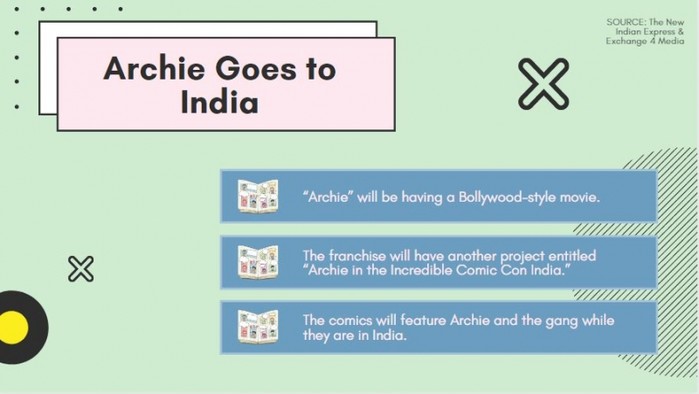 이런 아치가 인도로 진출할 예정이다. 인도 최대 미디어 그룹인 센티넬에 따르면, 최근 아치 코믹스 출판사의 최고경영자(CEO)이자 발행인인 존 골드워터는 이메일을 통해 아치가 볼리우드 스타일의 영화로 재탄생하게 될 것이라고 밝혔다.