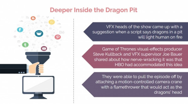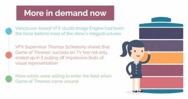 사실 여태까지 영화 제작자들은 TV 부문의 VFX에 큰 관심을 기울이지 않았다. 그런데 '왕좌의 게임'이 등장해 인기를 끌자 많은 아티스트들이 TV 부문에서도 일하고 싶어 했다. 이는 HBO가 예산 및 시간 면에서 드라마 제작을 충분히 지원할 수 있도록 만들었다.